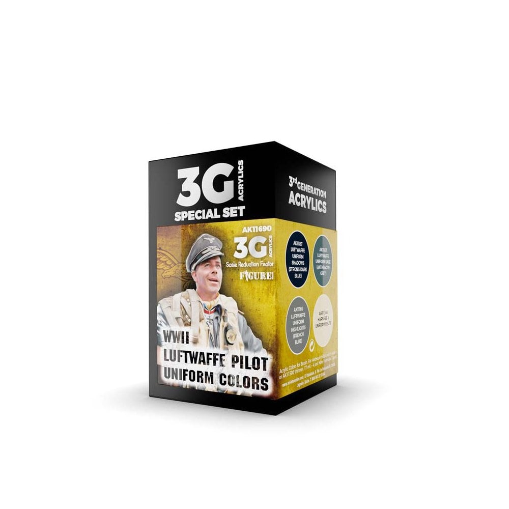 This set of 3rd Generation acrylic paints is selected for painting figures of the German Luftwaffe pilots from WWII era.It includes the three tones intended for finishing the uniform and a specific color suitable for painting the harness. This set contains:AK11187 Luftwaffe Uniform Shadows (Strong Dark Blue)AK11167 Luftwaffe Uniform Base (Anthracite Grey)AK11866 Luftwaffe Uniform Highlights (French Blue)AK11388 Harness & Uniform Belts
