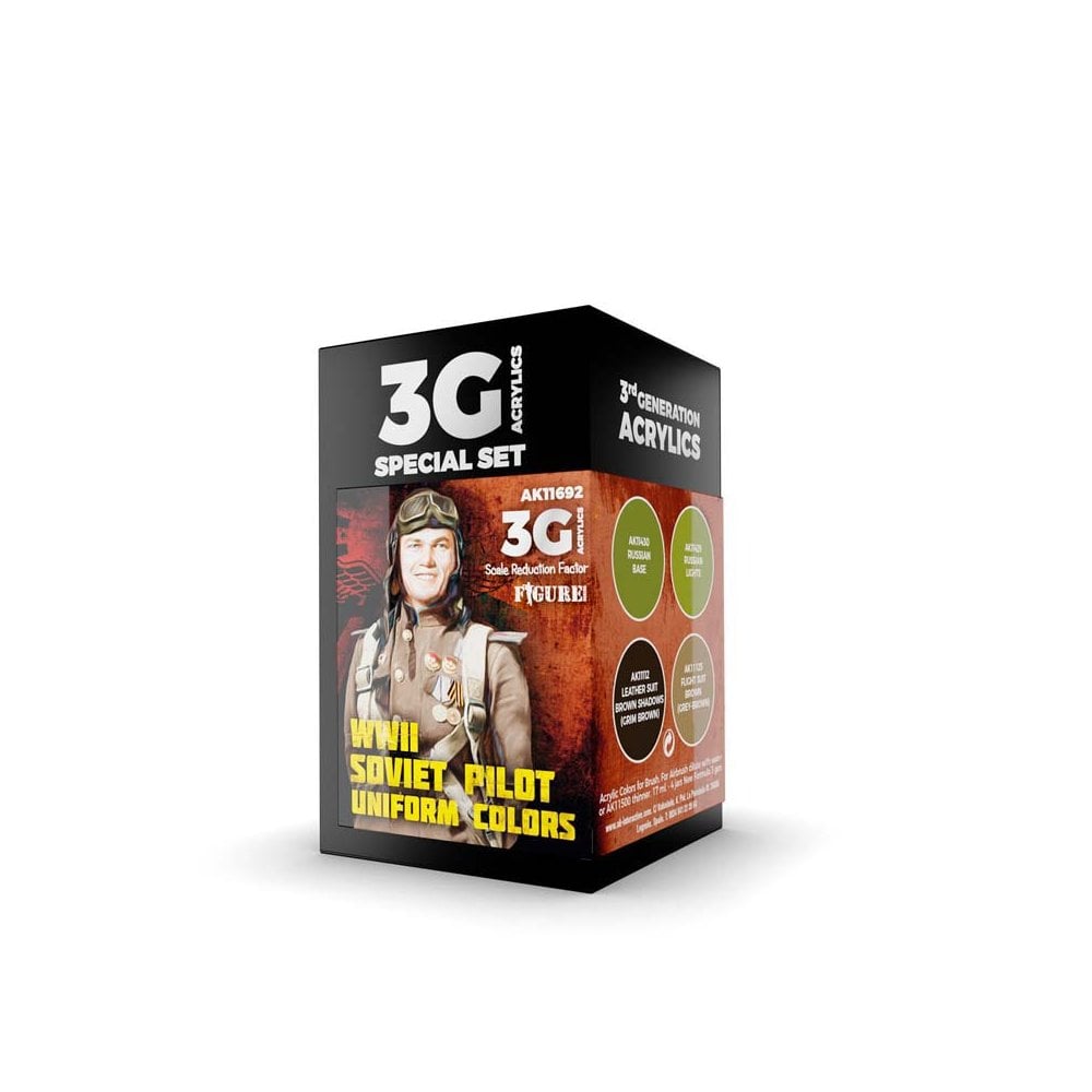 This third generation set is selected with colors to paint figures of Soviet pilots of the Second World War.It includes four tones intended for painting different types of clothes and uniforms worn by the pilots. This set contains:AK11430 Russian BaseAK11429 Russian LightsAK11112 Leather Suit Brown Shadows (Grim Brown)AK11125 Flight Suit Brown (Grey-Brown)