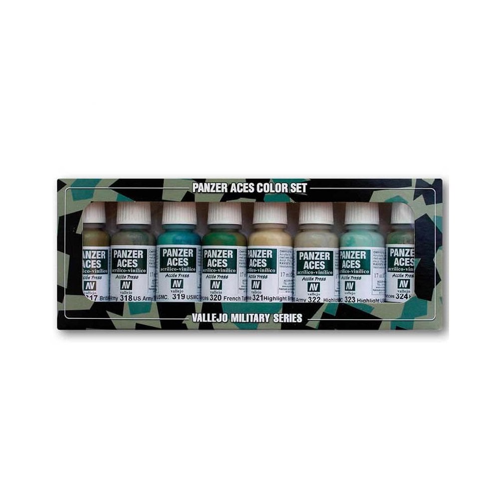 Contains 8 x 17 ml./0.57 fl.oz. especial colors for the weathering of tanks, tires, tarps, lights, ribbons, periscopes, and uniforms for the crew, skin tones and camouflage patterns.Content:70.317 British Tank Crew70.318 US Army Tank Crew70.319 USMC Tank Crew70.320 French Tank Crew70.321 British Tank Crew Highlights70.322 US Tank Crew Highlights70.323 USMC Tank Crew Highlights70.324 Highlights French Tank Crew