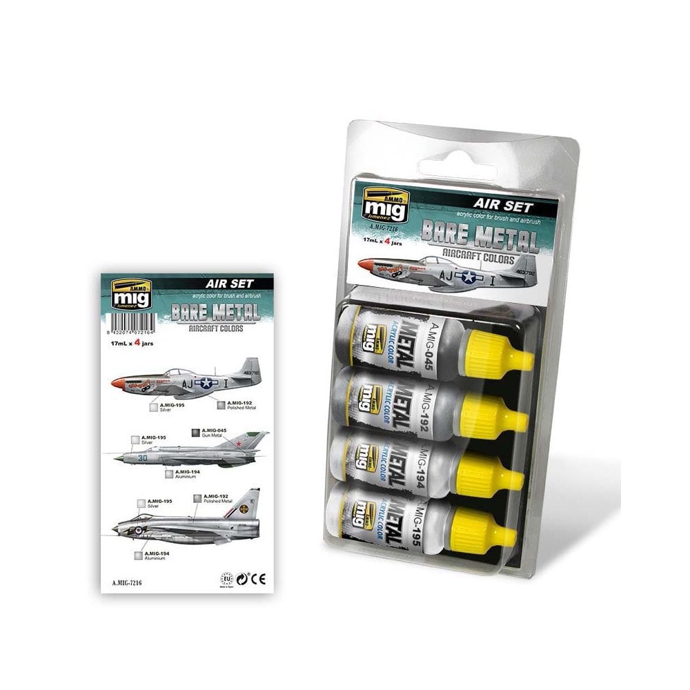 Even though metal has been present since the dawn of aviation history, its importance as a building material has changed over time. It was from WWII on that a great deal of aircraft began being left unpainted to show the metals used in their construction. At first sight it may appear that there is just one type of metal skin, but that´s not the case. In fact, we can find a diverse range of materials and tonalities on the same subject. This versatile set comes to the rescue with accurate colors and no mixing required. Formulated for maximum performance with both brush and airbrush. Four acrylic colors in 17ml jars. Shake well before each use. Each jar includes a stainless steel ball agitator to facilitate mixture. They are water soluble, odorless, and non-toxic. We recommend A.MIG-2000 Acrylic Thinner for best thinning results. Dries completely in 24 hoursIncluded colors:A.MIG-0045 Gun MetalA.MIG-0192 Polished MetalA.MIG-0194 Matt AluminiumA.MIG-0195 Silver