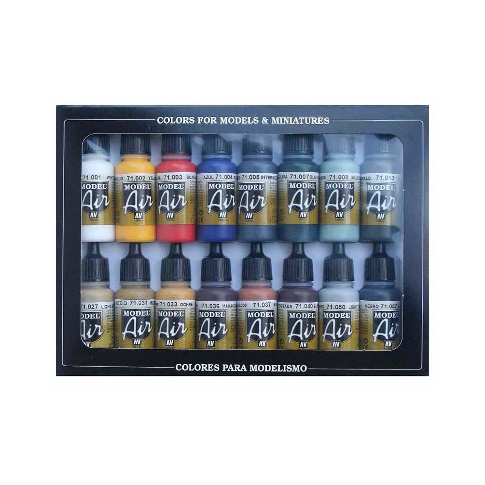 Basic Colors Set Vallejo Model Air 71.178 Matt acrylic colors, water-based and especially formulated for airbrushing. The Model Air color range contains the most complete selection of the military colors used in recent history, including the colors of WWI, WWII and up to the present. Each color is based on extensive research by our experts of the existing and previous military references so as to offer the modeler the highest possible historical accuracy. Model Air is used directly or diluted with Vallejo Airbrush Thinner or Flow Improver. It is recommended to first prime the surface, and then apply Model Air in several layers. The colors dry very rapidly and form a homogenous paint film of extraordinary resistance while preserving even the smallest detail of the model. For airbrushing these colors, the compressor air pressure is recommended at 15 ‚¨ 20 PSI or 0.5 to 1 kg. Model Air can of course also be applied with a brush. For correct airbrush maintenance we recommend using the Vallejo Airbrush Cleaner.Safety:¬¨‚†Model Air is not flammable, and does not contain solvents. Please see also certified safety information of the product on the Safety page.Packaging:¬¨‚†Model Air is presented in bottles of 17 ml./0.57 fl.oz. with eyedropper. This packaging prevents the paint from evaporating and drying in the container, so that It can be used in minimal quantities and preserved for a long time.