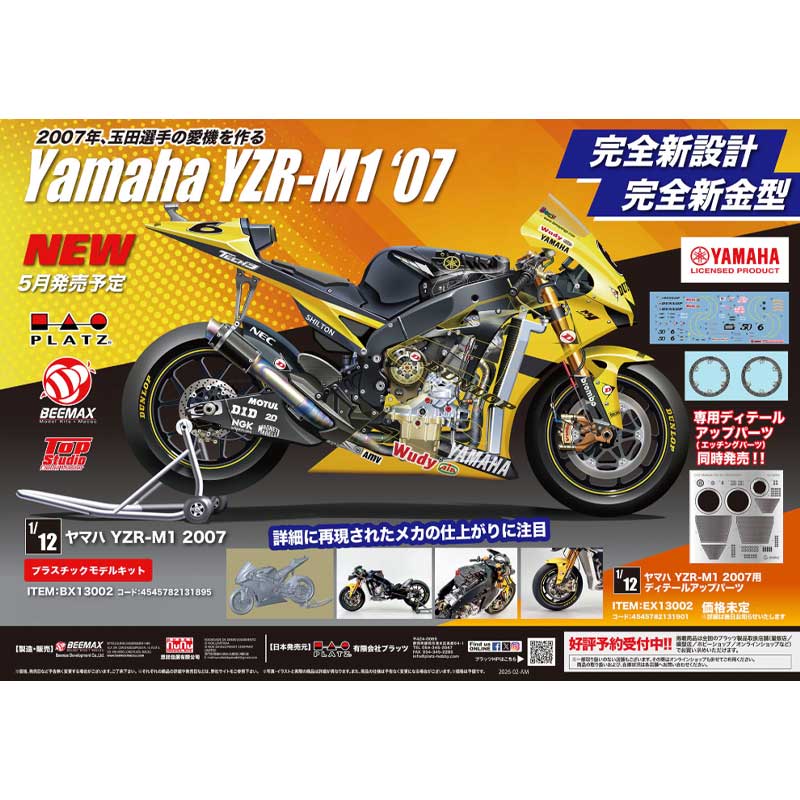 This 1/12 scale Yamaha YZR-M1 from Beemax represents the factory MotoGP machine developed for the 2007 season, following the regulation change from 990cc to 800cc engines. Designed to be lighter and more compact, the YZR-M1 retained its competitive edge through refined engineering and aerodynamic improvements. The model captures the aggressive styling and precise form of this high-performance racing motorcycle.