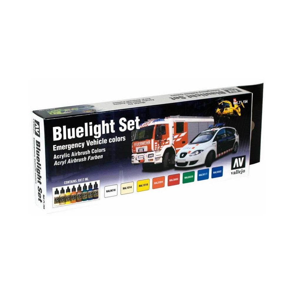 Bluelight Set Set Vallejo Model Air 71.154 Matt acrylic colors, water-based and especially formulated for airbrushing. The Model Air color range contains the most complete selection of the military colors used in recent history, including the colors of WWI, WWII and up to the present. Each color is based on extensive research by our experts of the existing and previous military references so as to offer the modeler the highest possible historical accuracy. Model Air is used directly or diluted with Vallejo Airbrush Thinner or Flow Improver. It is recommended to first prime the surface, and then apply Model Air in several layers. The colors dry very rapidly and form a homogenous paint film of extraordinary resistance while preserving even the smallest detail of the model. For airbrushing these colors, the compressor air pressure is recommended at 15 ‚¨ 20 PSI or 0.5 to 1 kg. Model Air can of course also be applied with a brush. For correct airbrush maintenance we recommend using the Vallejo Airbrush Cleaner.Safety:¬¨‚†Model Air is not flammable, and does not contain solvents. Please see also certified safety information of the product on the Safety page.Packaging:¬¨‚†Model Air is presented in bottles of 17 ml./0.57 fl.oz. with eyedropper. This packaging prevents the paint from evaporating and drying in the container, so that It can be used in minimal quantities and preserved for a long time.
