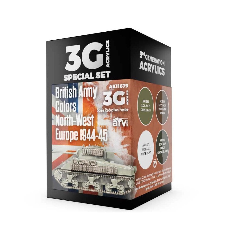 A special set of 3rd Generation acrylic paints including the four camouflage colors that were most commonly used for painting vehicles of British and Commonwealth forces deployed in the North-West Europe from 1944 until the end of World War II.These colors were used by the Canadian, Australian, New Zealand and other armies during the same period. This set contains:AK11386 S.C.C. No.15 Olive Drab.AK11384 S.C.C. No.1A Very Dark Brown.AK11372 Washable White Paint.AK11028 S.C.C. No.14 Black (Smoke Black).