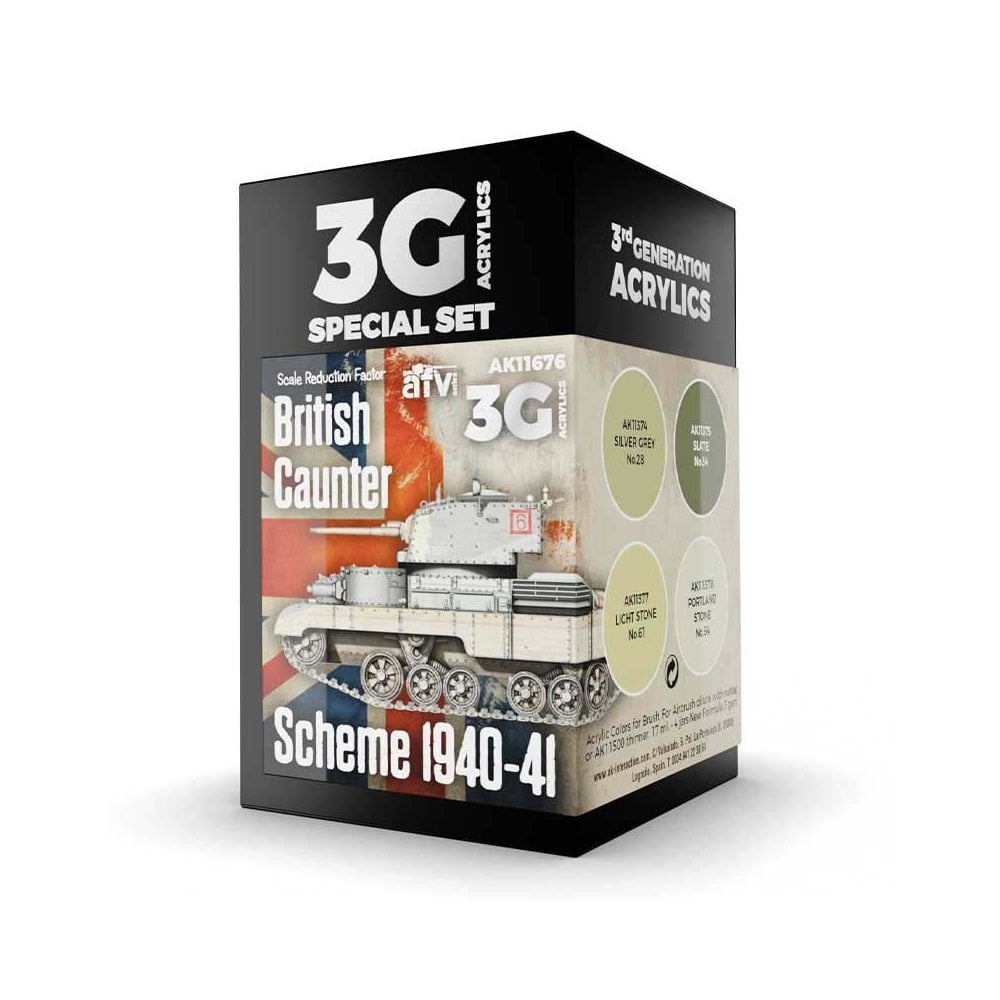 A special set of 3rd Generation acrylic paints including the four camouflage colors used for painting vehicles of British and Commonwealth forces deployed in North Africa and the Mediterranean, which were finished in the so-called Caunter Scheme employed from July 1940 until October 1941. This set contains:AK11374 Silver Grey N0.28.AK11375 Slate No.34.AK11377 Light Stone No.61.AK11378 Portland Stone No.64.