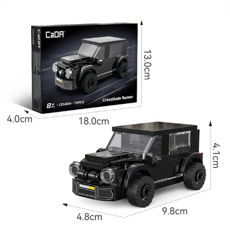 This Mini Crossblade Runner SUV from CaDA Bricks is a compact 1/48 scale brick model inspired by modern sport utility vehicles. Featuring a bold black colour scheme and boxy styling, the model reflects the rugged and practical design often associated with contemporary SUVs. Its small size makes it a quick and enjoyable build while still delivering a recognisable vehicle shape.