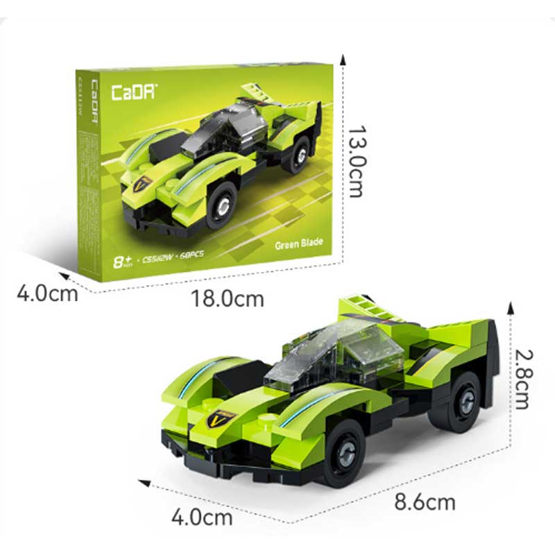 This Mini Green Blade Sports Car from CaDA Bricks is a compact 1/48 scale brick model inspired by modern high-performance sports cars. Featuring a bold green and black colour scheme, the model captures a sharp, angular design that reflects contemporary automotive styling. Its small size makes it an accessible and quick build while still offering a recognisable and dynamic appearance.