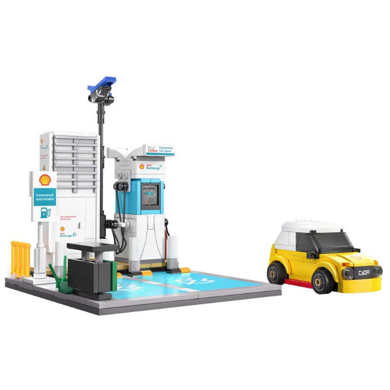 This Shell Charging Station from CaDA Bricks is a detailed brick model representing a modern electric vehicle charging point. Officially licensed by Shell, the model captures the clean and recognisable design of contemporary EV infrastructure, complete with branding and a compact layout. A small yellow and white car is also included, adding context and display value.