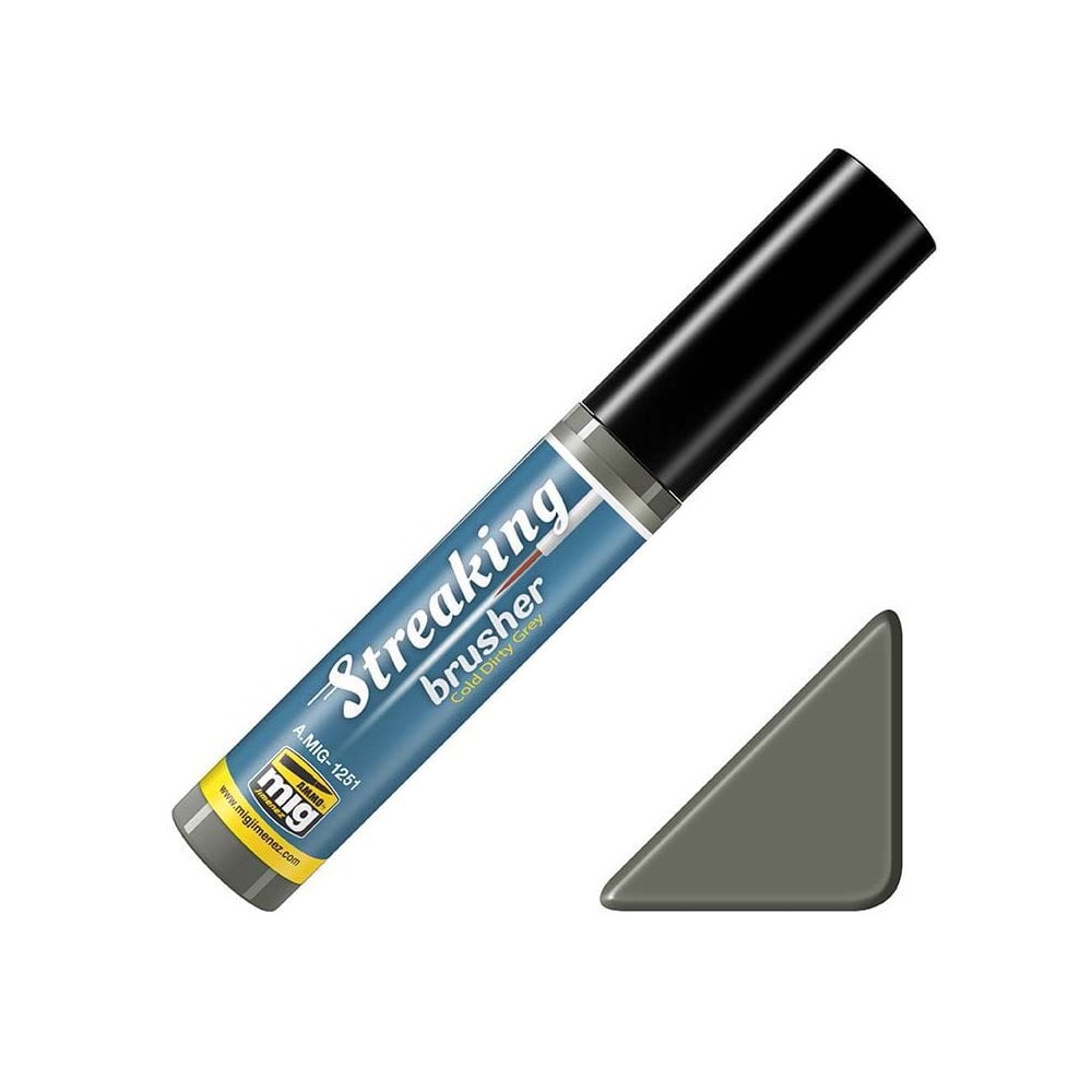 Cold Dirty Grey Streaking Brusher Ammo Mig Jimenez A.MIG-1251One of AMMO´s best and most popular classic products is now available in an innovative container that will make the entire process of adding streaking effects to your models a more enjoyable experience with accurate results. The STREAKING range of products must be applied with a brush in vertical lines to be blended, create the effect of streaked dirt and grime. To simplify this universally used technique, AMMO has turned to the innovative presentation utilized for our OILBRUSHERS range: a container with a built-in brush suited to the technique making application much easier and quicker.The new STREAKINGBRUSHER range feature a unique applicator brush with longer bristles which facilitate tracing the long and narrow vertical lines of this particular weathering effect. This new applicator brush will definitely save you valuable modelling time with ease of application and clean up. The unique bottles take up less space on your workbench, and up to 70% less surface area of your workspace when compared to the original presentation of the Streaking line. Save time, space, and effort when applying painting and weathering effects with the new and innovative STREAKING BRUSHER.