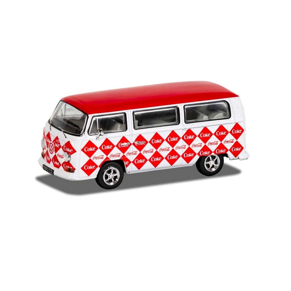 This 1/43 scale die-cast model from Corgi presents the classic second-generation Volkswagen Type 2, commonly known as the “Bay Window” for its distinctive curved windscreen. Released as a Coca-Cola Diamond Edition, it features a bold red-and-white colour scheme with an all-over diamond motif, making it a vibrant addition to any VW or Coca-Cola collection.