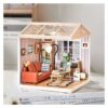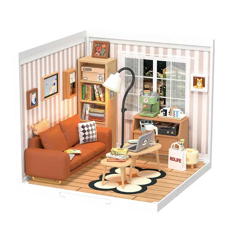 Rolife Cozy Living Lounge Miniature House DW007 is designed to create a charming miniature world, offering a cozy, comfortable, and leisurely living room experience. This DIY miniature kit features a warm wooden-style design. Especially the upright leather sofa is perfect for sharing laughter with family or savoring a cup of coffee alone.