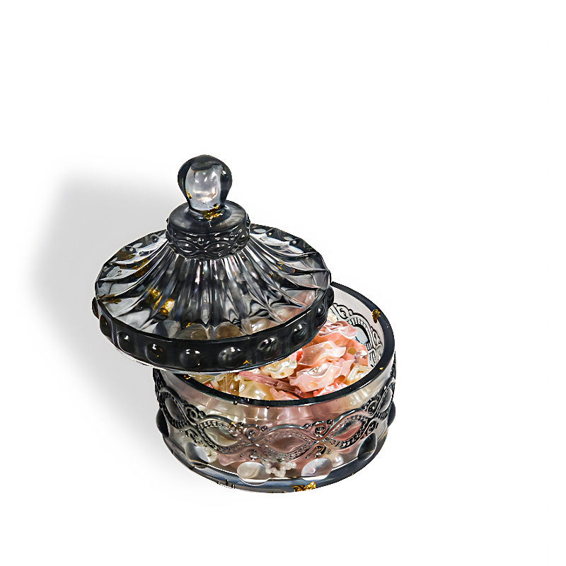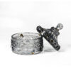 - Round container shape with decorative exterior detailing