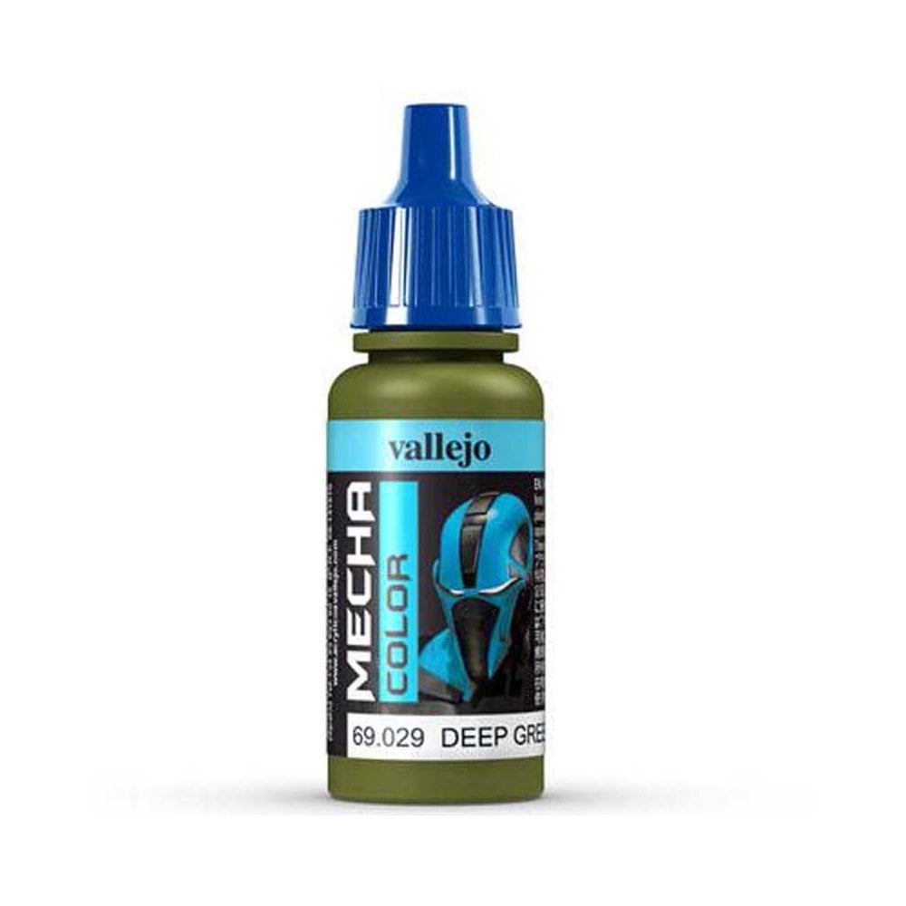 Deep Green 69.029 Vallejo Mecha Color New formula acrylic colors with a satin finish, extra resistant and impact proof especially designed for airbrushing surfaces exposed to aggressive manipulation. The advanced formulation contains a revolutionary component which guarantees exceptional adherence on even the most difficult surfaces, and offers great resistance to rough handling, impact, friction, scratches, etc. Once dry, the Mecha surface looks the same as the original plastic of the model, while yet the smallest details of the original remain clearly visible. The color range includes primers as well as special varnishes ‚¨ also with an exclusive formulation- and a series of colors for aging and weathering effects. It is recommended to apply the Mecha colors in several layers on the previously primed surface; a few hours after application the colors will have dried to form a homogenous coating of extraordinary strength and resistance. Mecha Color can be airbrushed directly or diluted with Vallejo Airbrush Thinner or Flow Improver, and the colors can also be applied by brush. The compressor adjustment recommended is 15 ‚¨ 20 PSI o 0.5 to 1 kg. For best airbrush maintenance we recommend using the Vallejo Airbrush Cleaner.Safety: Mecha Color is not flammable, and does not contain solvents. Please see also certified safety information of the product on the Safety page.Packaging: Mecha Color is available in 17 ml./0.57 fl.oz. bottles (with eyedropper). Mecha Primer and Mecha Varnish are also available in 60 ml./2.02 fl.oz. and 200 ml./6.76 fl.oz. bottles (with flip top and eyedropper).