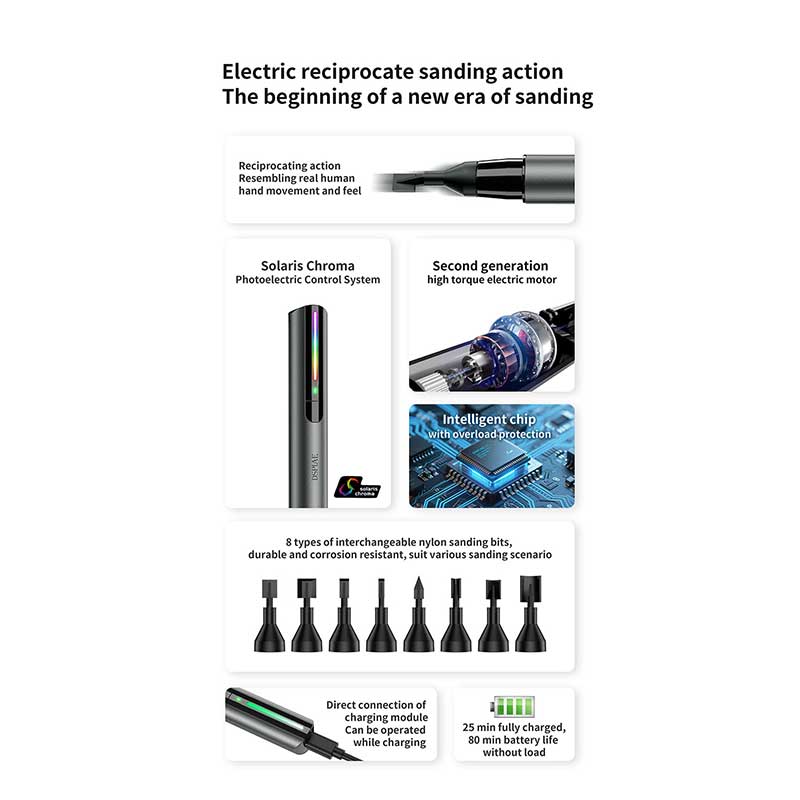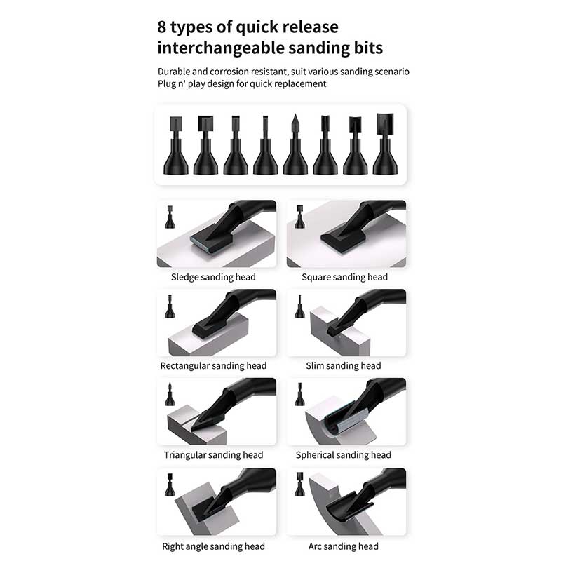 - 8 interchangeable sanding bits: Durable nylon heads in multiple shapes (sledge, square, rectangular, slim, triangular, spherical, right-angle, and arc) for varied sanding needs.