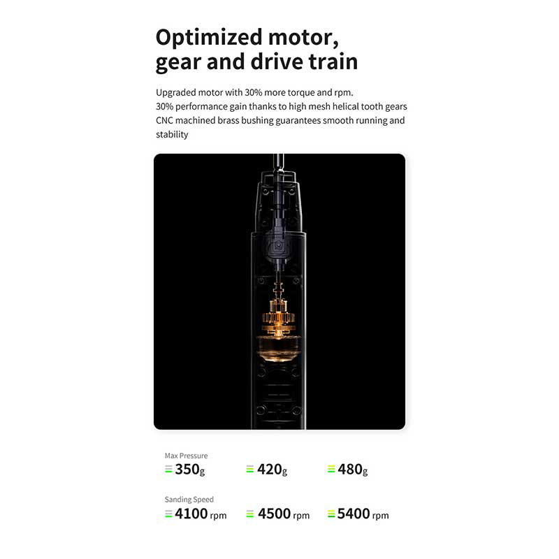 - Second-generation high-torque motor: 30% more torque and RPM with CNC brass bushings for stable, quiet performance.