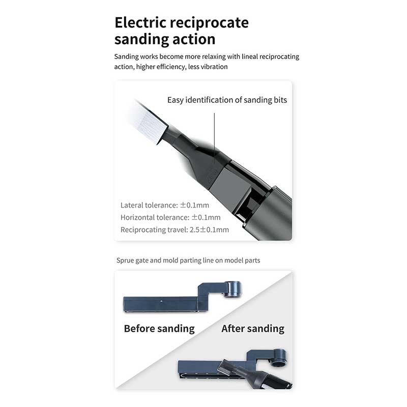 - Reciprocating sanding action: Mimics natural hand movement for realistic control and smooth operation.