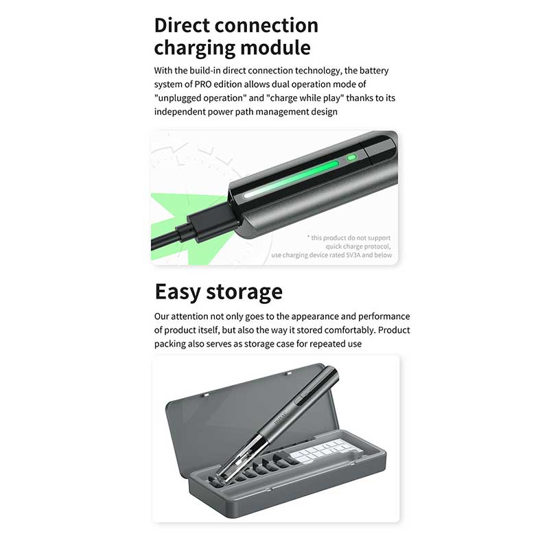 - Charging and power: USB-C direct-connection module enables operation while charging; full charge in 25 minutes for up to 80 minutes of continuous use.