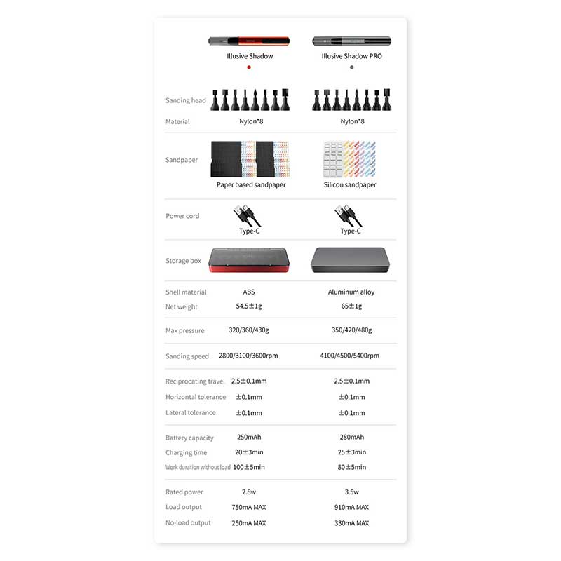 - Dedicated silicon sandpaper sheets: 8 shapes × 7 grits (#180 – #1200) × 3 pcs each