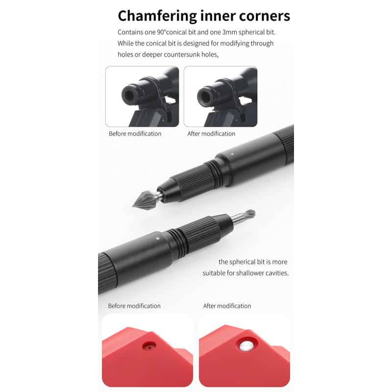 This versatile chamfering tool is designed for precision modifications to plastic models, featuring both inner and outer chamfering options in one compact unit.