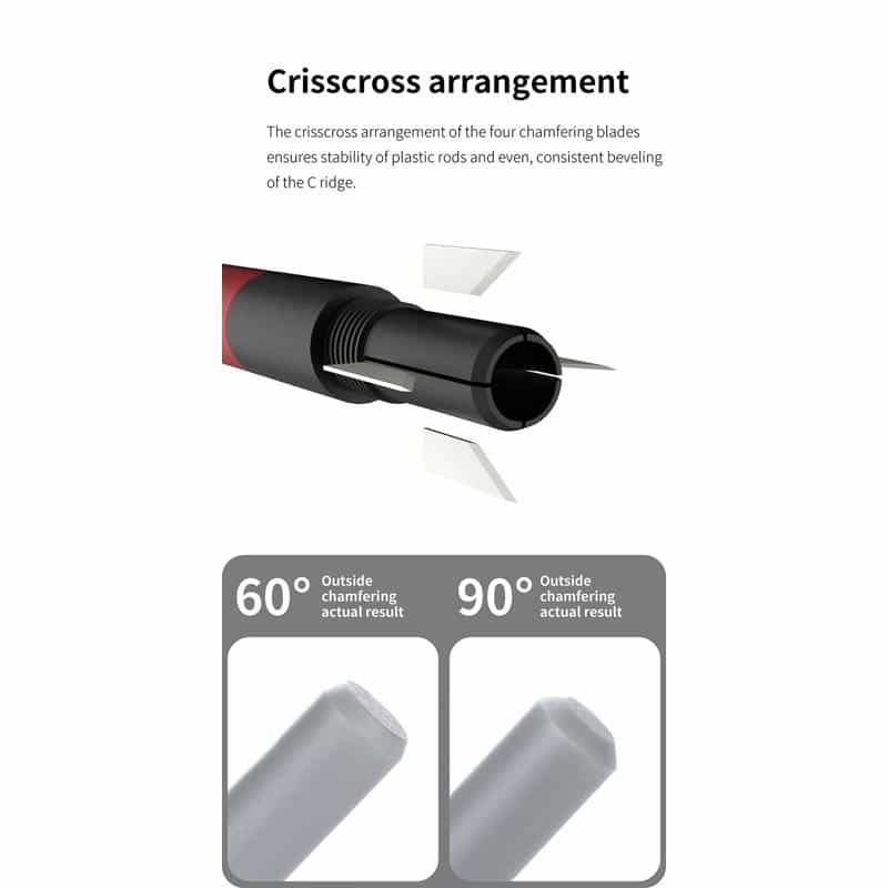 Four carbon steel blades arranged in a cross pattern ensure even, consistent beveling and stable positioning of plastic rods during chamfering.