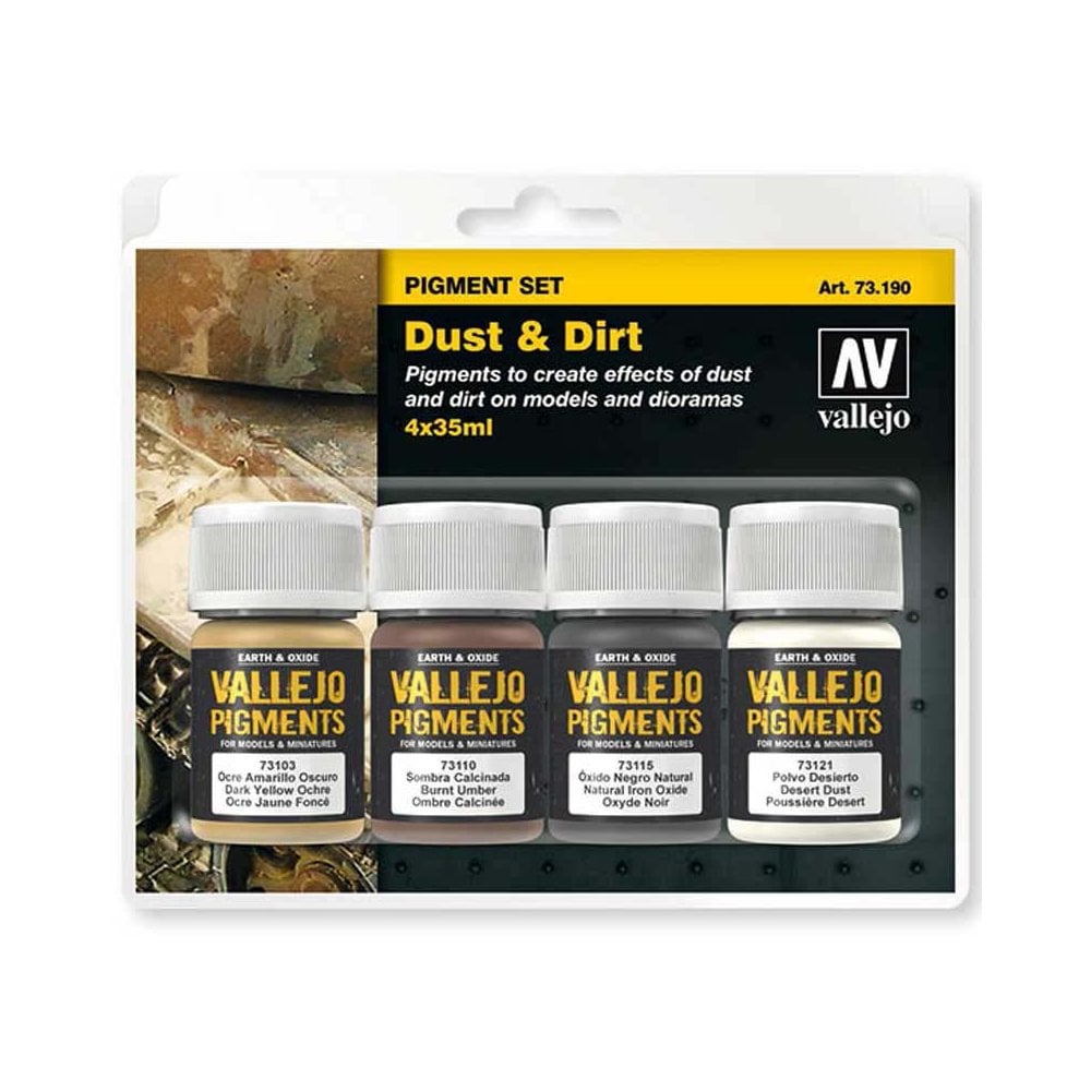 Dust & Dirt Pigment Set Vallejo 73.190The pigment set includes a step by step guide by Chema Cabrero to assist in creating the effects of Dust & Dirt on models and dioramas.Content:4 x 35 ml./1.18 fl.oz. Pigments73.103 Dark Yellow Ochre73.110 Burnt Umber73.115 Natural Iron Oxide73.121 Desert Dust