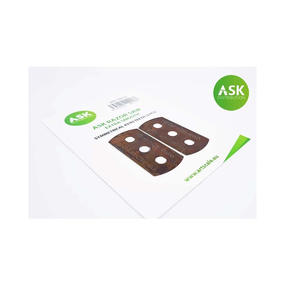 ASK Hardened high tech RAZOR SAW – Made in the Czech Republic.Constant tooth quality (depth, width, number) is what distinguishes this saw from existing traditionally produced saws. The saw is designed for very fine work – cutting plastic sprues and resin casting blocks. Perfect for cutting flaps for repositioning and re-engraving damaged panel lines. The saw is also suitable for cutting wood and thin brass and aluminium tube.This is an innovative high-quality product. The efficient setting of the production process enables a very attractive price – which opposes established standards, where a higher price means higher quality. We have a product of the highest quality – at an attractive price.Package contains 2 saws. Each side of the saw has a different size of teeth (medium and fine).Attention! This product is not a toy. Not suitable for children under 14 years. Children should only use the product under adult supervision.