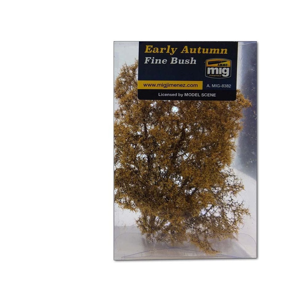 Fine Bush – Early Autumn Ammo Mig Jimenez A.MIG-8382Extremely realistic vegetation material used to create all types of bushes and trees in all scales; for small scenes, dioramas, and railway modeling. Brush can easily be cut with scissors to create small bushes, or fix it to other sprigs to create larger areas of vegetation or tree foliage. Simply position and fix in place using white glue.