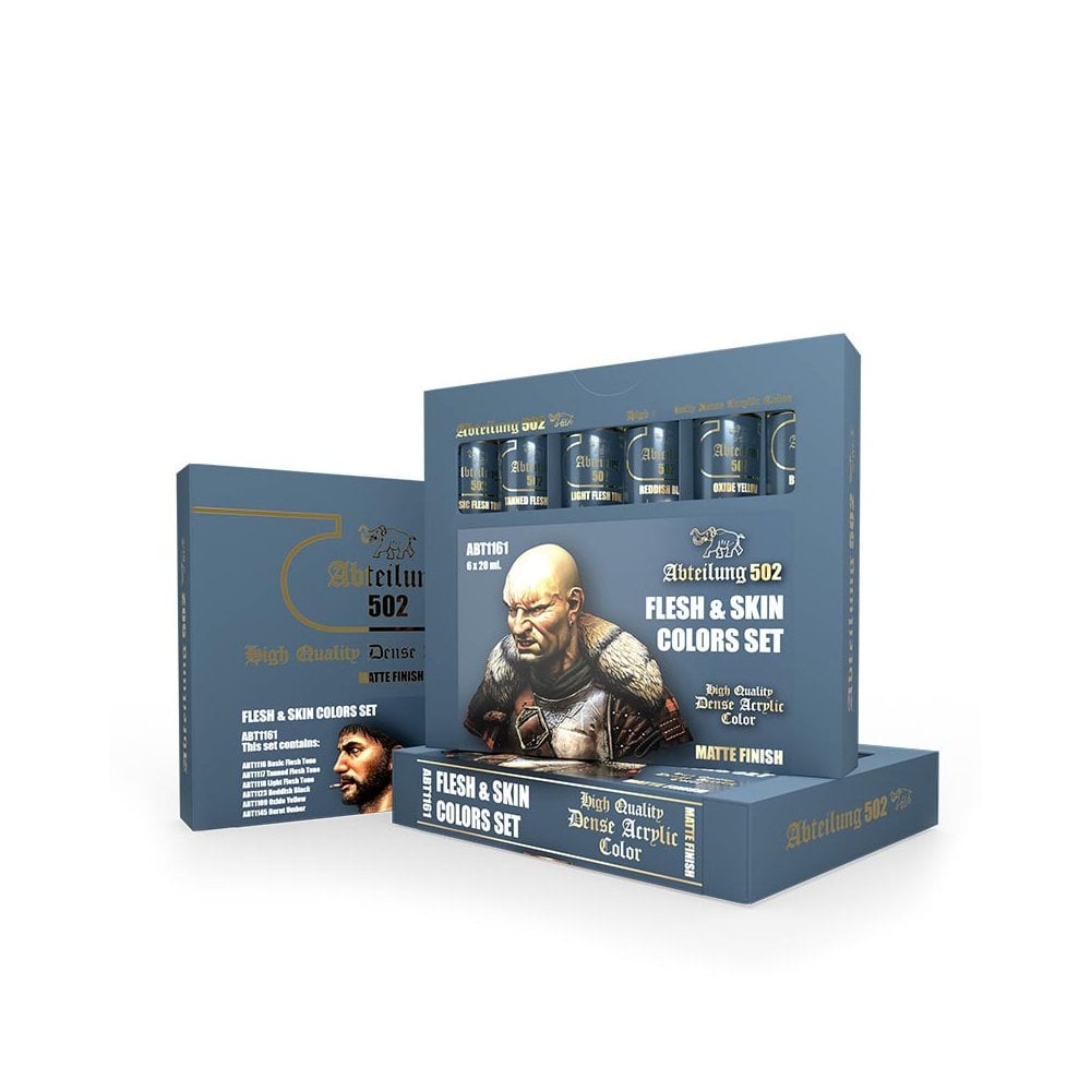 The Abteilung 502 acrylic tube range for artists has a formula that offers maximum opacity and coverage, combined with the vividness and intensity of the color, and provides a matte finish.Specially designed for figure painters looking for the highest quality pigment finish,Abteilung 502 artist colors also have fine art applications such as painting on canvas or airbrushing or illustration, combining the short drying times with the smooth finish and endless possibilities of acrylics. The High Quality Dense Acrylics range from Abteilung 502 covers all the needs that artists and modelers may ever have. Their matte finish makes them perfect for figure painting and detailing, although they can be used in many waysThis set has a selection of shades to paint different types of skin from very light to more tanned. The combination of the colors from this set allows to create infinite nuances and finishes.Contains:ABT1116 Basic Flesh ToneABT1117 Tanned Flesh ToneABT1118 Light Flesh ToneABT1123 Reddish BlackABT1109 Oxide YellowABT1145 Burnt Umber