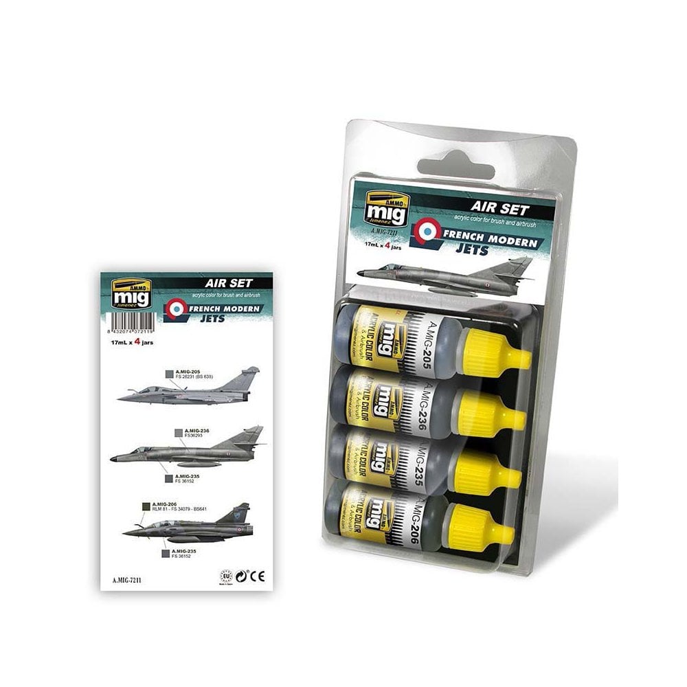 Accurate colors for French aircraft camouflage schemes, 4 jars 17mLHigh-quality acrylic paints specially formulated to represent most of the camouflage schemes currently used by French aircraft, like the Mirage 2000D and Air Force and Navy¬¥s Rafales or the recently withdrawn Super √âtendard among others. This set solves problems and doubts when mixing accurate base colors, saving precious modeling time. These exact color have been slightly lightened to compensate for the ‘scale effect’ which will allow us to apply the correct color on our models. Formulated for maximum performance both with brush and airbrush. Four acrylic colors in 17ml jars. Shake well before each use. Each jar includes a stainless steel ball agitator to facilitate mixture. Water soluble, odorless and non-toxic. We recommend A.MIG -2000 Acrylic Thinner for correct thinning. Dries completely in 24 hours.Included colors:A.MIG-205 FS26231 (BS 638)