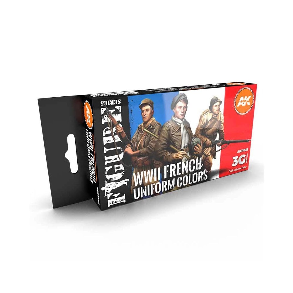 This 3Gen set includes a selection of tones for painting the uniforms of the French Army in various theatres during WWI and WW2. This set contains:AK11427 Green Uniform Base.AK11436 Uniform Light (Canvas Tone).AK11435 Field Drab.AK11422 Ocher Khaki.AK11111 Dark Brown Leather (Burnt Umber).AK11120 Leather Scuffs (Mud Brown).