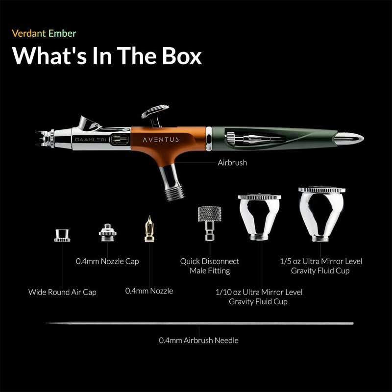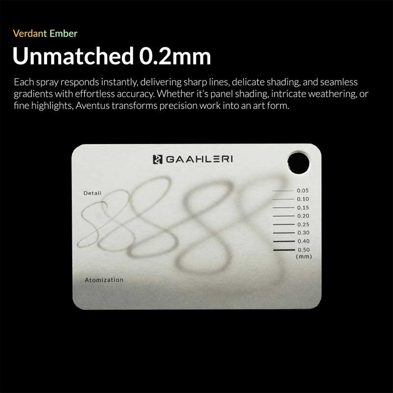 The Gaahleri Aventus Verdant Ember airbrush is a fully re-engineered tool designed to deliver smooth control, refined atomisation and improved comfort. Machined from a single block of aluminium, its seamless construction provides a balanced and stable feel, making it well suited to both detailed work and extended airbrushing sessions.
