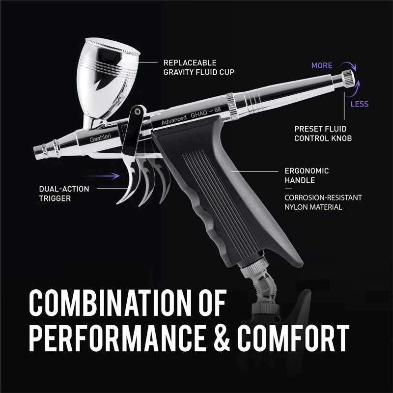 The Gaahleri Advanced Series GHAD-68 is designed to deliver strong spraying performance with added comfort, making it well suited to longer airbrushing sessions. Its ergonomic layout and pistol-style trigger help reduce strain, offering improved control and consistency across a wide range of applications.