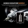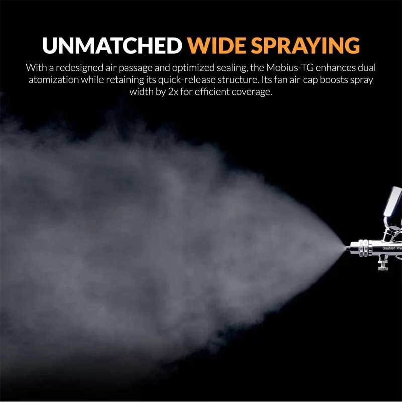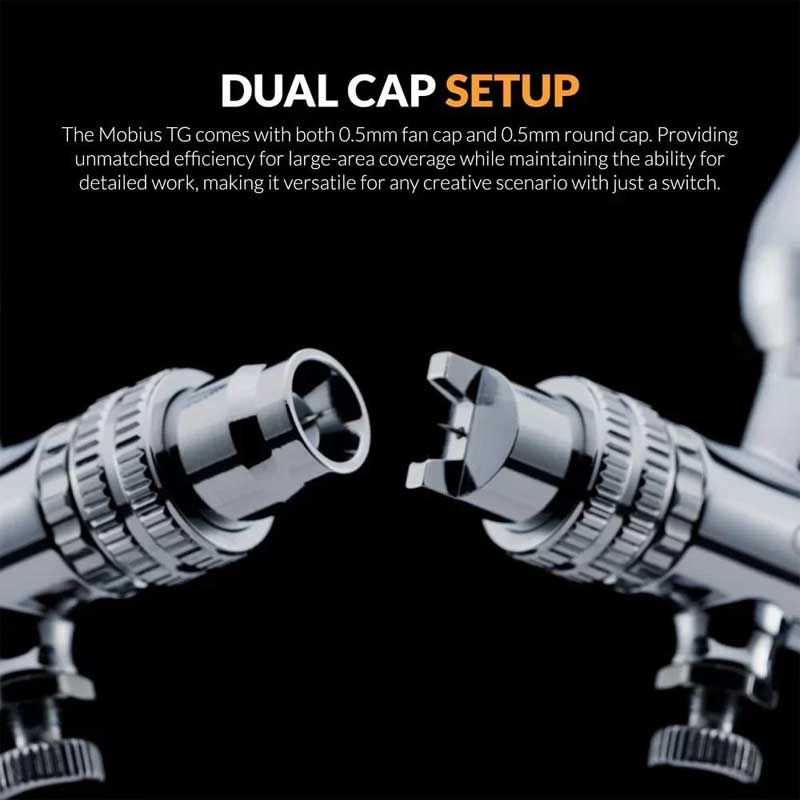 Designed with versatility in mind, the Mobius TG includes both a fan cap for wide spray patterns and a round cap for more focused detailing. Its ergonomic construction, smooth trigger action and enhanced airflow system provide a comfortable and consistent experience, making it suitable for extended use across a range of airbrushing tasks.