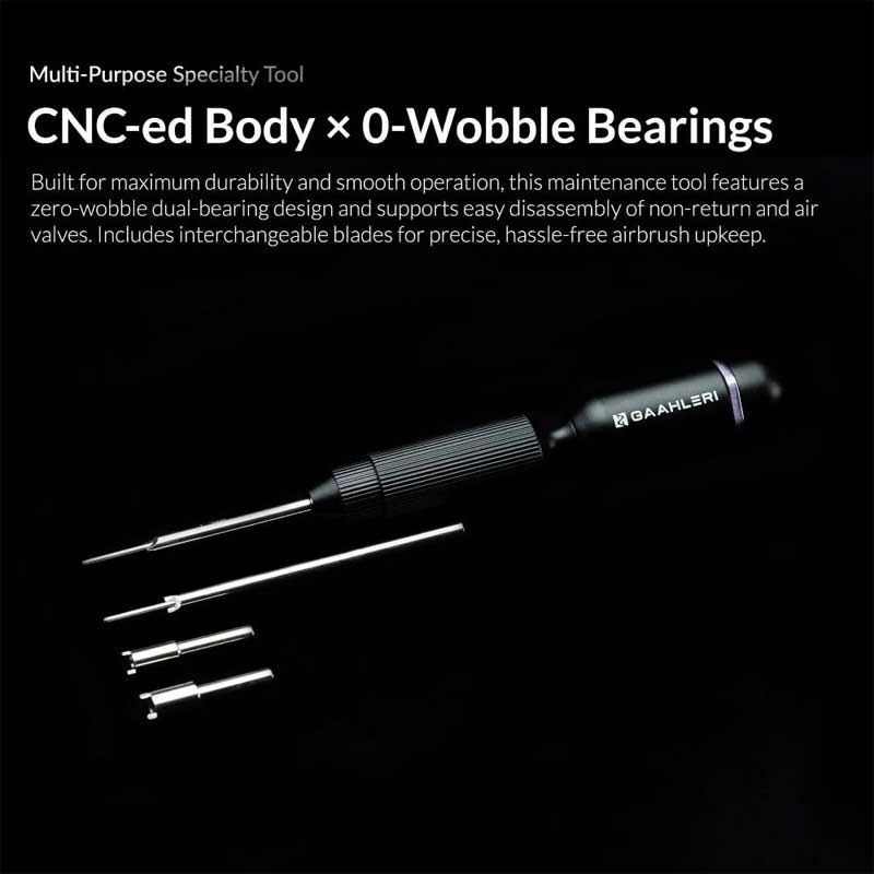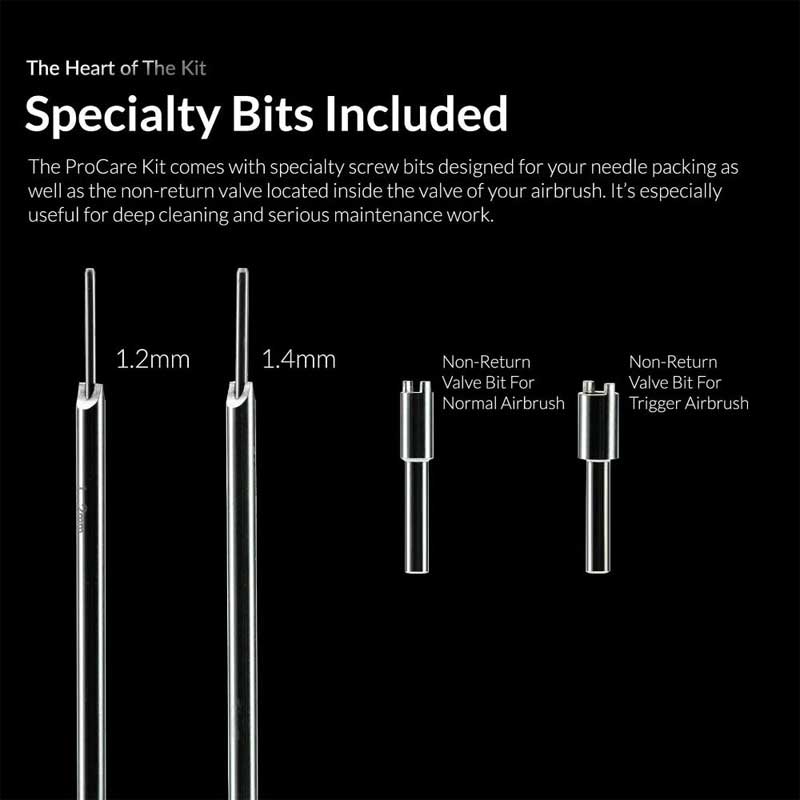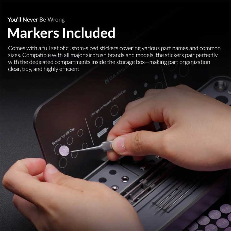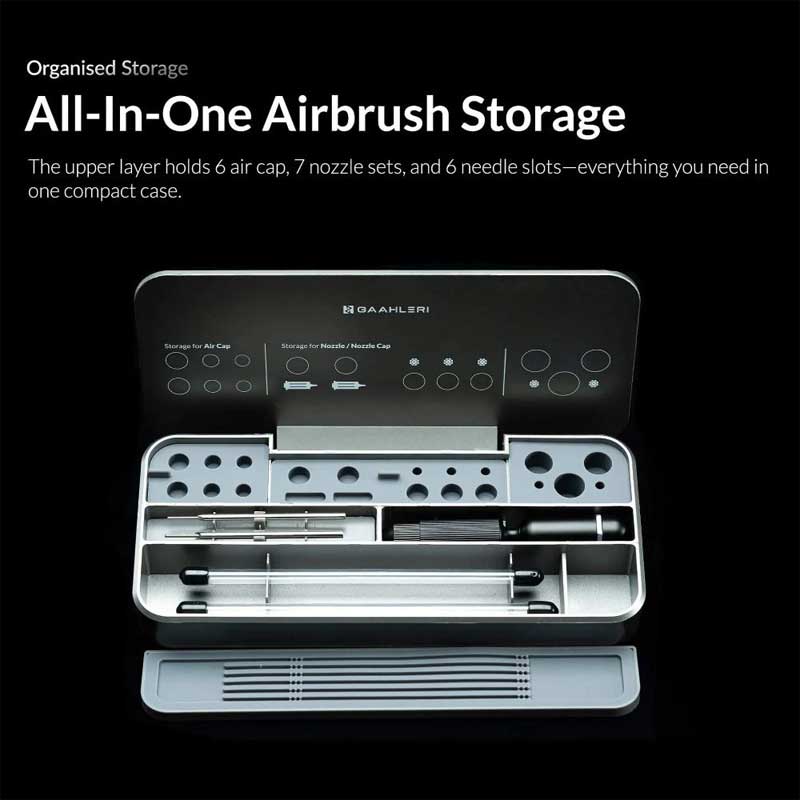 The dual-layer layout provides dedicated space for a wide range of components, while included trays and labels help maintain a clear and organised setup. Combined with a precision maintenance tool, the kit supports both storage and servicing, making it a useful addition for anyone working regularly with airbrush equipment.