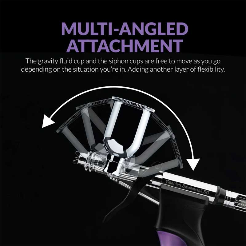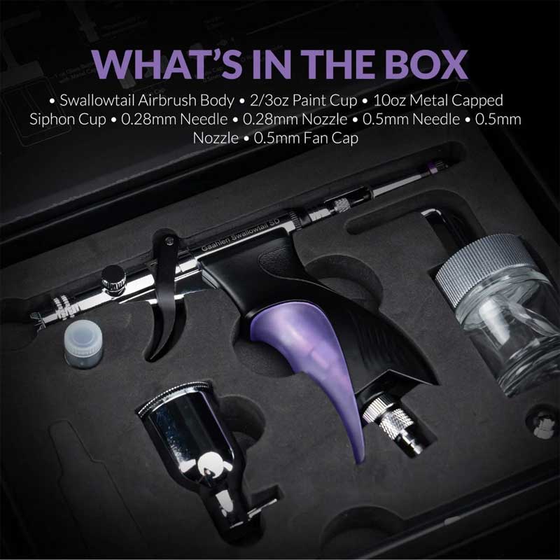 With dual nozzle options and both gravity and siphon feed capabilities, the Swallowtail SD offers strong versatility across a wide range of airbrushing tasks. The combination of ergonomic design and adaptable setup makes it suitable for modellers and artists looking for consistent performance and flexibility in their workflow.