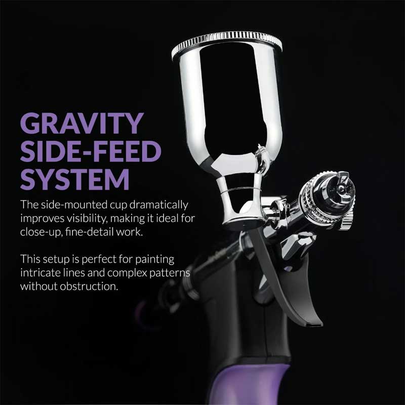 - Side-feed airbrush design for improved control and visibility