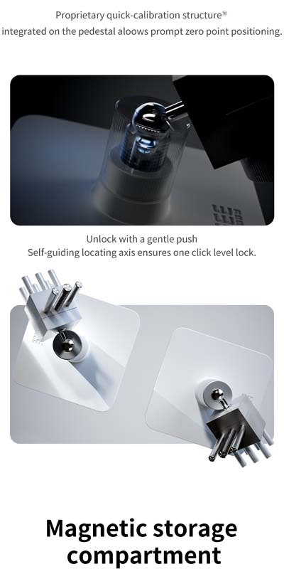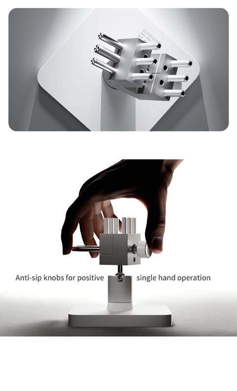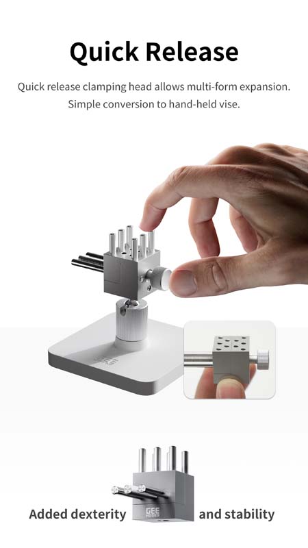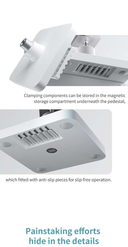 The integrated magnetic storage compartment keeps small components organised, while the anti-slip base ensures stable positioning during use. The quick release mechanism allows for easy adjustments and conversion to different working setups.