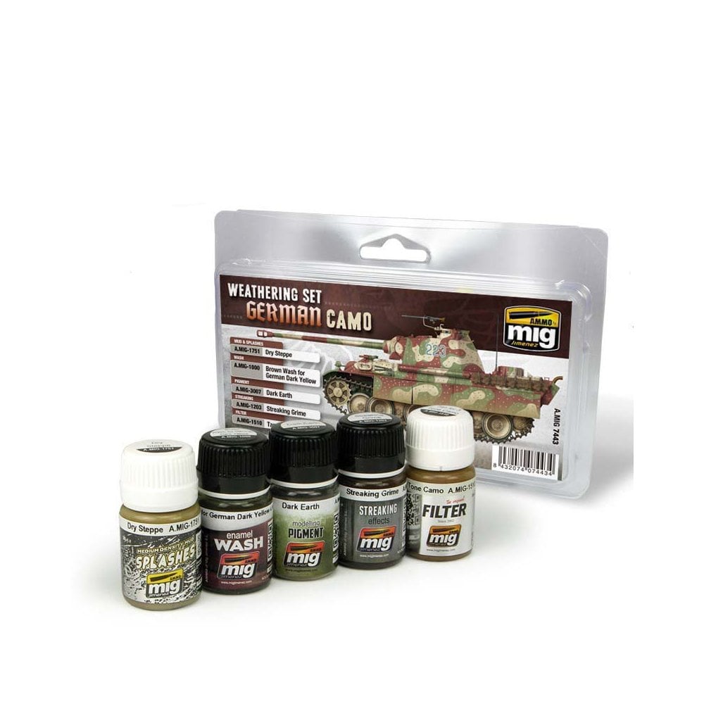 The indispensable finishing and weathering set for German camouflage schemes. With the ideal wash, streaking, filter, pigment, and mud splashes colors. These effects can be used for almost any German Camouflage to create a wide variety of realistic effects and finishes. Use them individually or in combination for a variety of effects.A.MIG-1000 WASH FOR GERMAN DARK YELLOW