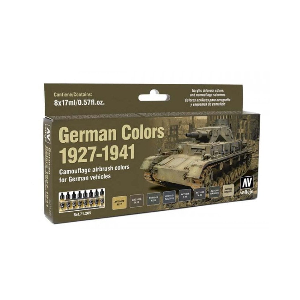 German Colors 1927-1941 Set Vallejo Model Air 71.205 Matt acrylic colors, water-based and especially formulated for airbrushing. The Model Air color range contains the most complete selection of the military colors used in recent history, including the colors of WWI, WWII and up to the present. Each color is based on extensive research by our experts of the existing and previous military references so as to offer the modeler the highest possible historical accuracy. Model Air is used directly or diluted with Vallejo Airbrush Thinner or Flow Improver. It is recommended to first prime the surface, and then apply Model Air in several layers. The colors dry very rapidly and form a homogenous paint film of extraordinary resistance while preserving even the smallest detail of the model. For airbrushing these colors, the compressor air pressure is recommended at 15 ‚¨ 20 PSI or 0.5 to 1 kg. Model Air can of course also be applied with a brush. For correct airbrush maintenance we recommend using the Vallejo Airbrush Cleaner.Safety:¬¨‚†Model Air is not flammable, and does not contain solvents. Please see also certified safety information of the product on the Safety page.Packaging:¬¨‚†Model Air is presented in bottles of 17 ml./0.57 fl.oz. with eyedropper. This packaging prevents the paint from evaporating and drying in the container, so that It can be used in minimal quantities and preserved for a long time.