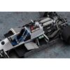 The model includes photo-etched metal parts for improved realism, including a pressed metal mesh funnel cover, sliding skirts, radiator mesh, and detailed brake discs. Seat belts are represented with cloth-style material for a more authentic appearance. Additional plastic parts include a 1970s style racing helmet, allowing for a period-correct display. A template for painting the tyre logo markings is also provided.