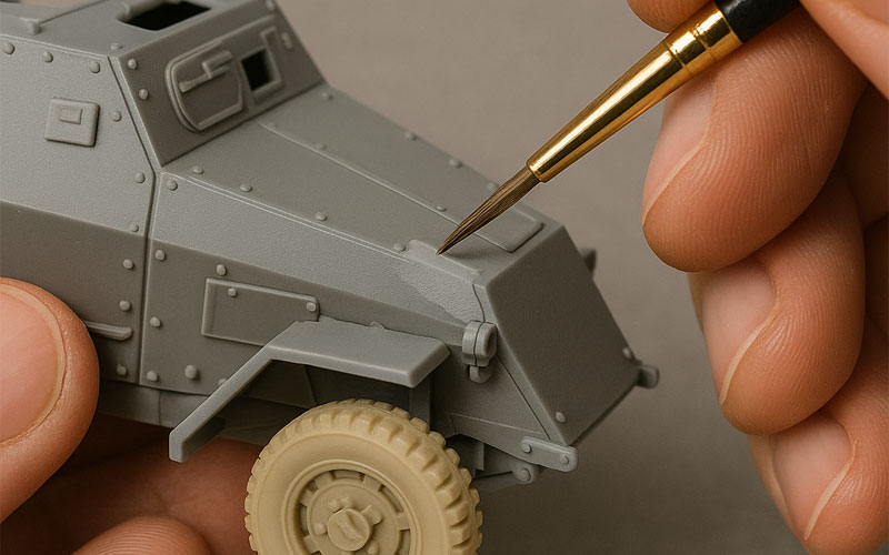 Use large flat brushes for basecoats and fine round brushes for detail. Quality brushes reduce streaks.