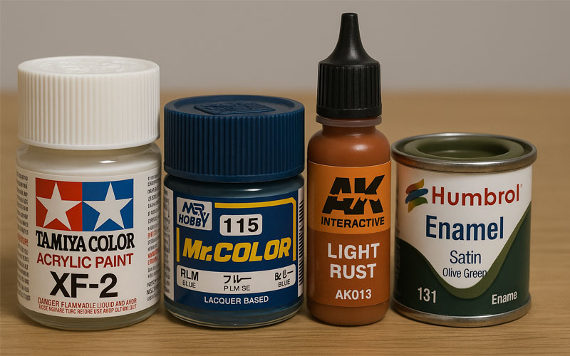Vallejo: Water-based acrylics offering seamless application and strong pigmentation. Model Colour and Game Colour are brush-friendly; Model Air is designed for airbrush but can be adapted.