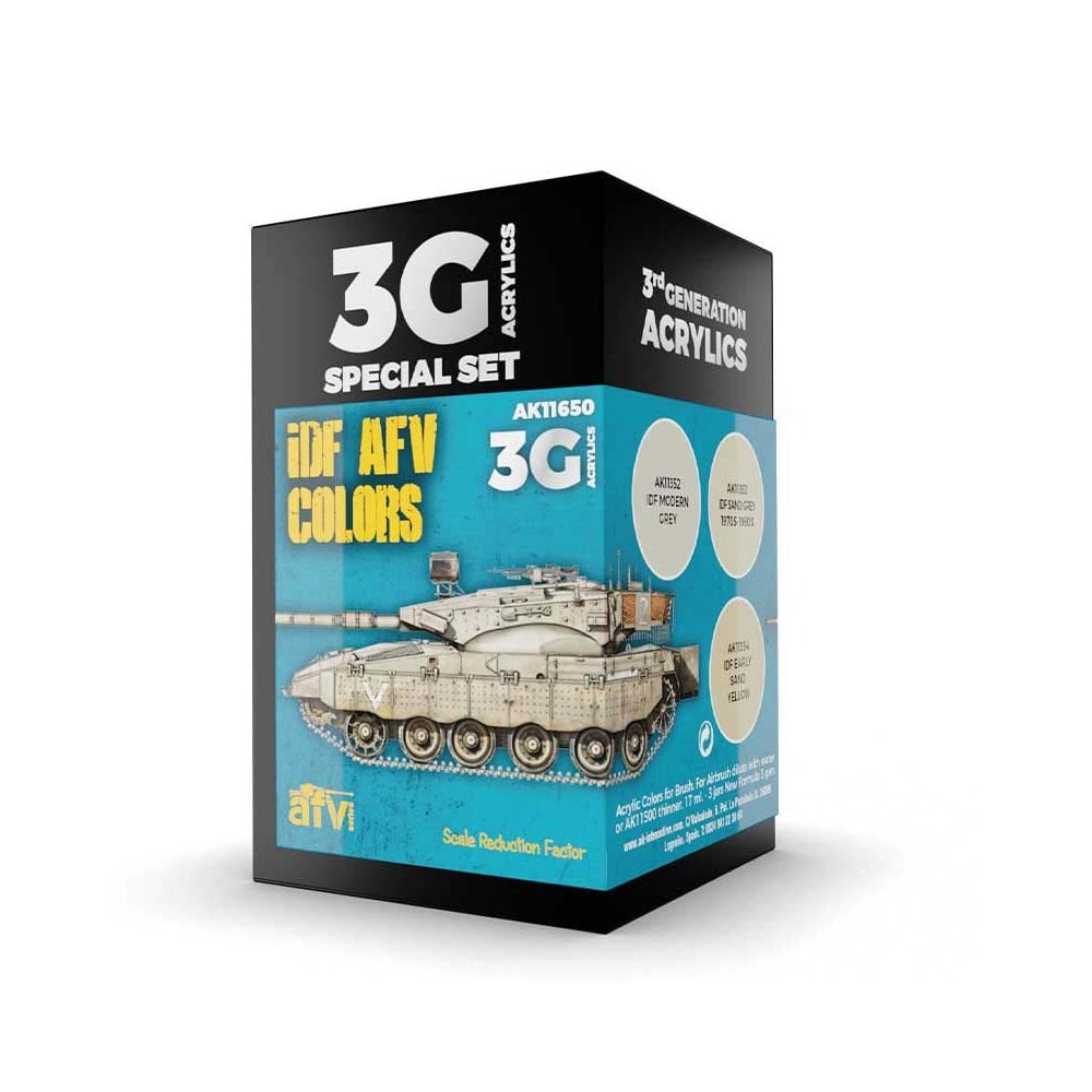 This 3rd Generation acrylic paint set contains the three standard colors used for painting the Israeli Defence Forces vehicles from its foundation until today.IDF Early Sand Yellow was typical for the late 1950s and 1960s, and was widely used until the Yom Kippur War in 1973 on tanks such as the AMX-13, Shermans, early M48 Pattons and the majority of the Centurions (Shot).After the Yom Kippur War, it remained in use in the South and the Sinai Peninsula.After the 1973 war, more IDF land forces were positioned in the Northern frontiers, and their vehicles received a darker tone, a Sand Grey, which was more suitable for blending with the greyish terrain color of the North of Israel.IDF Modern Grey is the current IDF paint introduced in May 1981. This set contains:AK11352 IDF Modern Grey.AK11353 IDF Sand Grey 1970s-1980s.AK11354 IDF Early Sand Yellow.