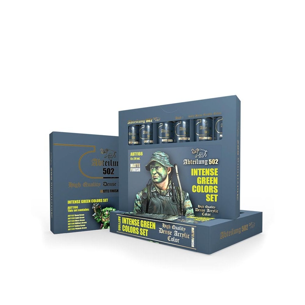 The Abteilung 502 acrylic tube range for artists has a formula that offers maximum opacity and coverage, combined with the vividness and intensity of the color, and provides a matte finish.Specially designed for figure painters looking for the highest quality pigment finish,Abteilung 502 artist colors also have fine art applications such as painting on canvas or airbrushing or illustration, combining the short drying times with the smooth finish and endless possibilities of acrylics. The High Quality Dense Acrylics range from Abteilung 502 covers all the needs that artists and modelers may ever have. Their matte finish makes them perfect for figure painting and detailing, although they can be used in many waysGreen tones are the focus of this set. The combinations of the included colors allow to paint different military figures, fantastic figures or any other piece in which green tones are important to be made. The tones are rich and blend easily to create shadows and undertones. Contains:ABT1137 Deep Green ABT1138 Light Green ABT1139 Moss Green ABT1140 Military Green ABT1111 Yellow Green ABT1136 Phthalo Green