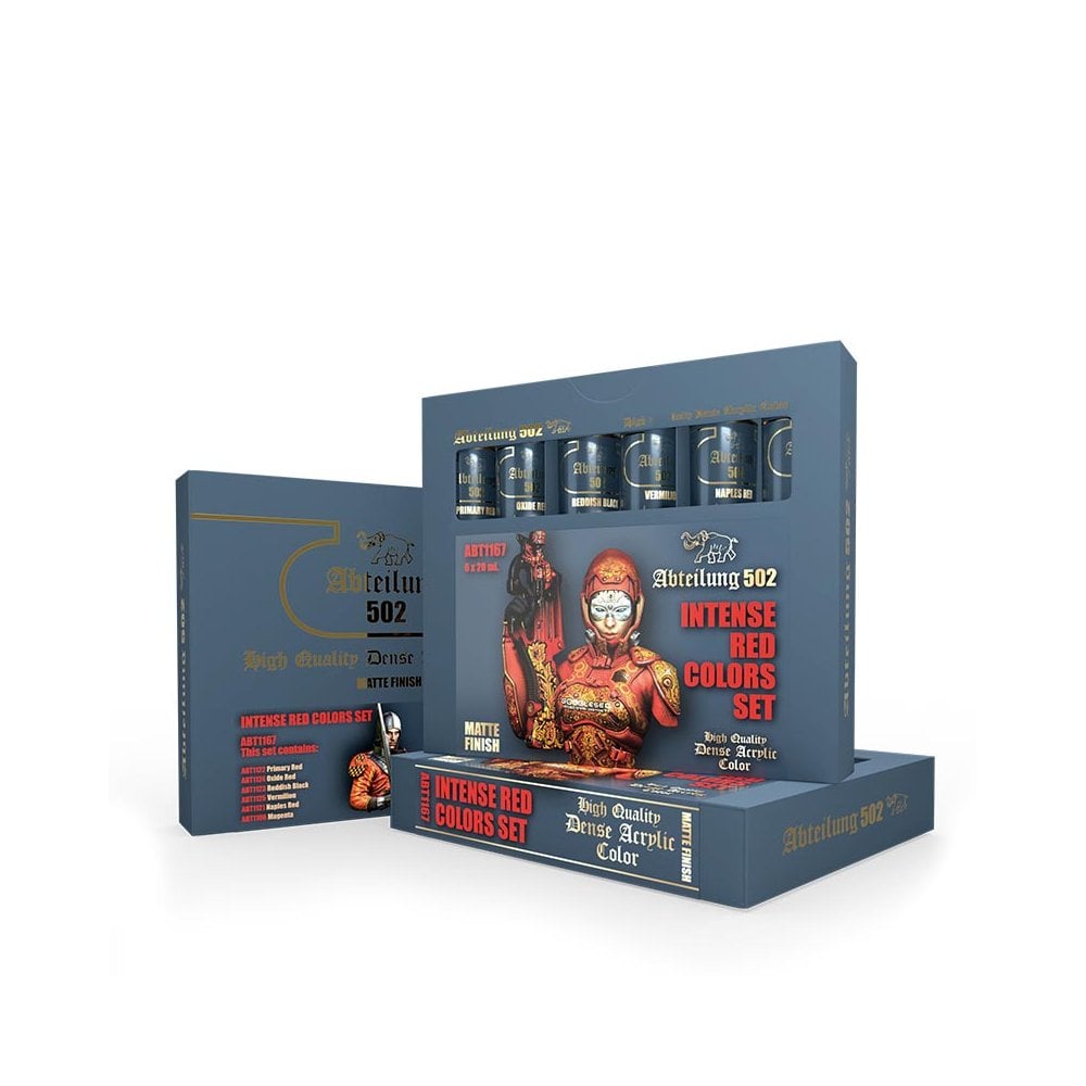 The Abteilung 502 acrylic tube range for artists has a formula that offers maximum opacity and coverage, combined with the vividness and intensity of the color, and provides a matte finish.Specially designed for figure painters looking for the highest quality pigment finish,Abteilung 502 artist colors also have fine art applications such as painting on canvas or airbrushing or illustration, combining the short drying times with the smooth finish and endless possibilities of acrylics. The High Quality Dense Acrylics range from Abteilung 502 covers all the needs that artists and modelers may ever have. Their matte finish makes them perfect for figure painting and detailing, although they can be used in many waysThe intensity of the colors in this set makes the red tones highlight the finishes of your figures like you have never seen before. This set contains a selection of red colors with which you can get a multitude of combinations. Contains:ABT1122 Primary Red ABT1124 Oxide Red ABT1123 Reddish Black ABT1125 Vermilion ABT1121 Naples Red ABT1106 Magenta