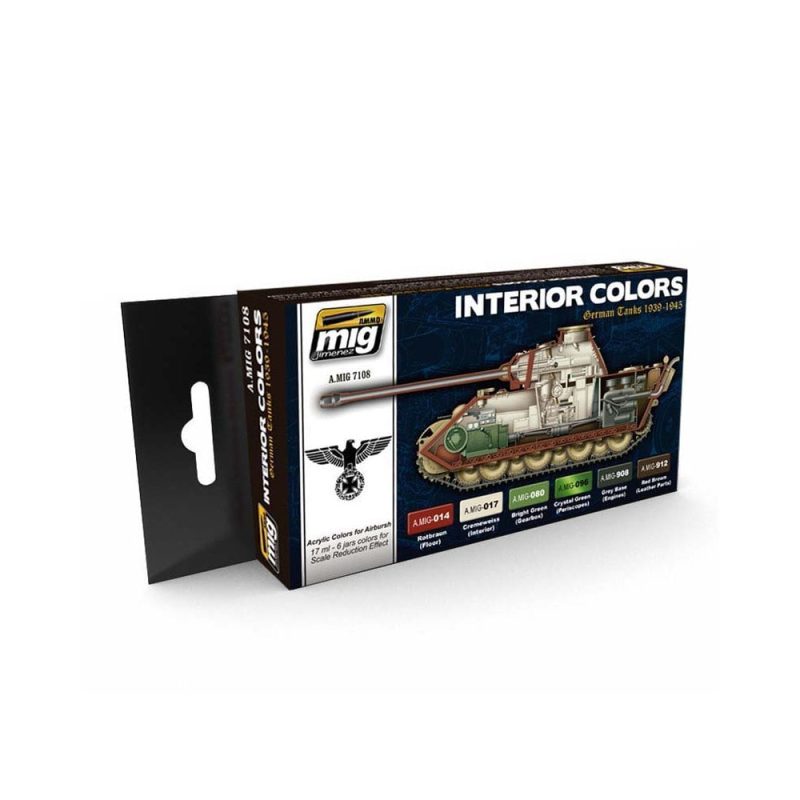 Specific set for painting the interior colors of WWII German vehicles. All 6 jars are acrylic and are formulated for maximum performance both with brush or airbrush and the Scale Effect Reduction will allow us to apply the correct color on our models. Water soluble, odorless and non-toxic. Shake well before each use. Each jar includes a stainless steel agitator to facilitate mixture. We recommend MIG -2000 Acrylic Thinner for a correct thinning. Dries completely in 24 hours. Include colors: A.MIG-014 RAL 8012 Rotbraun: used for the floor and other areas such as engine deck etc.A.MIG-017 RAL 9001 Cremeweiss: Standard color to paint interiors of any close-casemate German vehicle. A.MIG-080 BRIGHT GREEN: Color used to for gear boxes and other mechanical parts.A.MIG-096 Crystal PERISCOPE GREEN (and tail light on): Crystal product perfect to paint periscopes. A.MIG-908 Grey Base: color used on engines, transmissions, levers, and other mechanical parts.A.MIG-912 Red Brown Shadow: color to paint any leather surface such as seats, head protectors, etc.