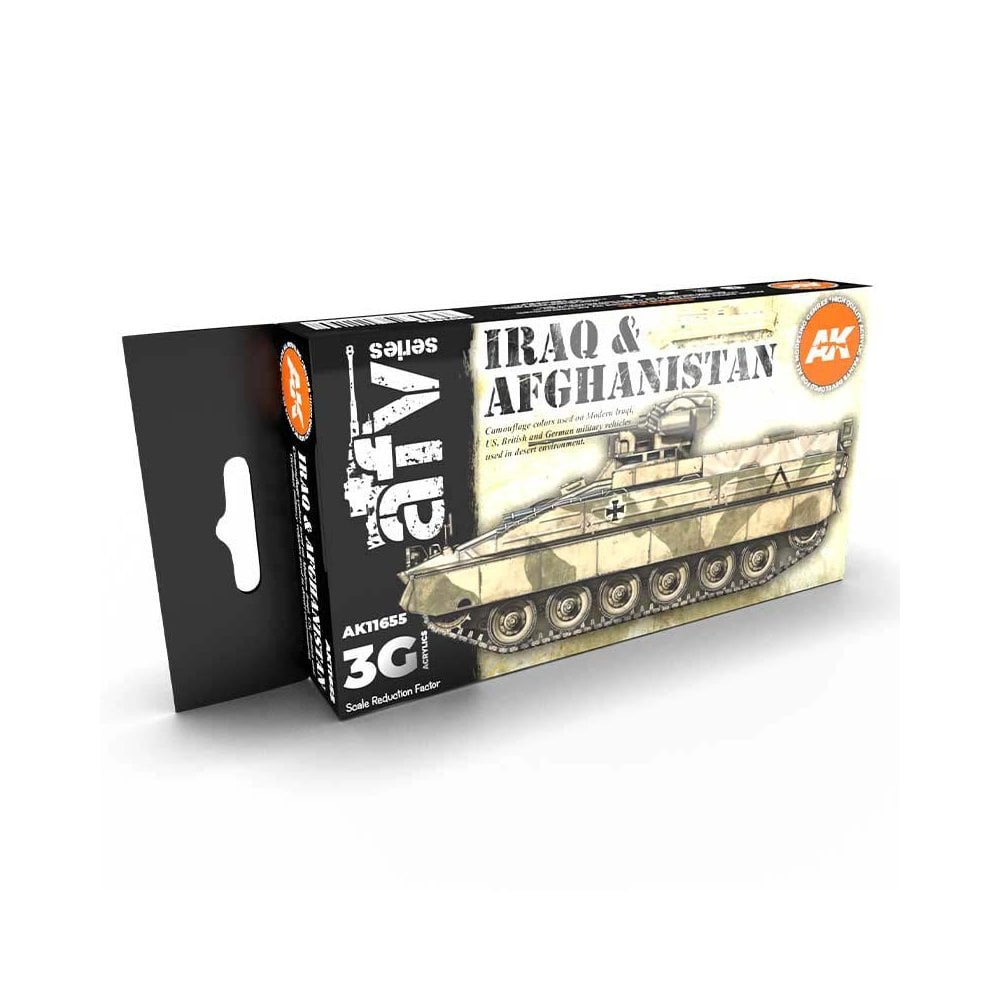 A 3rd Generation acrylic paint set including six camouflage colors used for painting Modern Iraqi, U.S., British and German vehicles employed in desert environment of Iraq or Afghanistan.It contains the different sandy tones used as base colors by the American, British and New Iraqi Army, and the three camouflage colors most commonly used by the German ISAF contingent. This set contains:AK11361 New Iraqi Army Sand.AK11362 British Sand Yellow.AK11349 Carc Tan 686A (FS33446).AK11326 RAL 8031 F9 Sandbraun.AK11325 RAL 1039 F9 Sandbeige.AK11323 RAL 6040 F9 Helloliv.