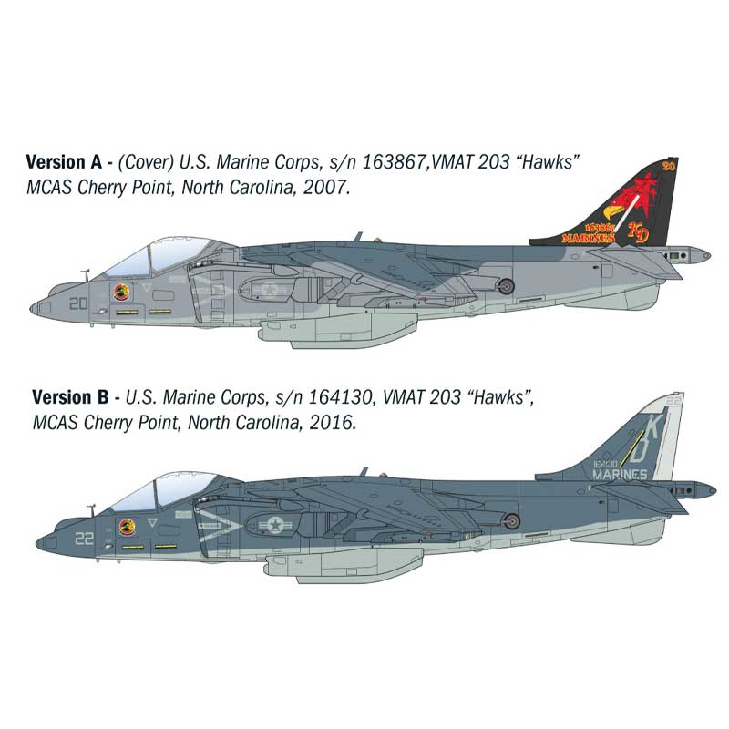 The kit builds to a finished length of approximately 19cm and features new box artwork along with an updated decal sheet providing markings for both U.S. Marine Corps and Spanish Army aircraft. Compact in scale but rich in character, it’s a great subject for modern jet collections or carrier-based displays.