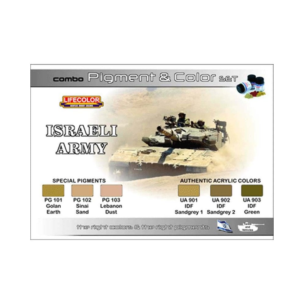 The LifeColor SPG01 set is designed for painting and weathering Israeli military vehicles. Combining three finely ground powder pigments with three authentic acrylic paint shades, this set provides a versatile range of tones for realistic finishes and subtle weathering effects on IDF models.