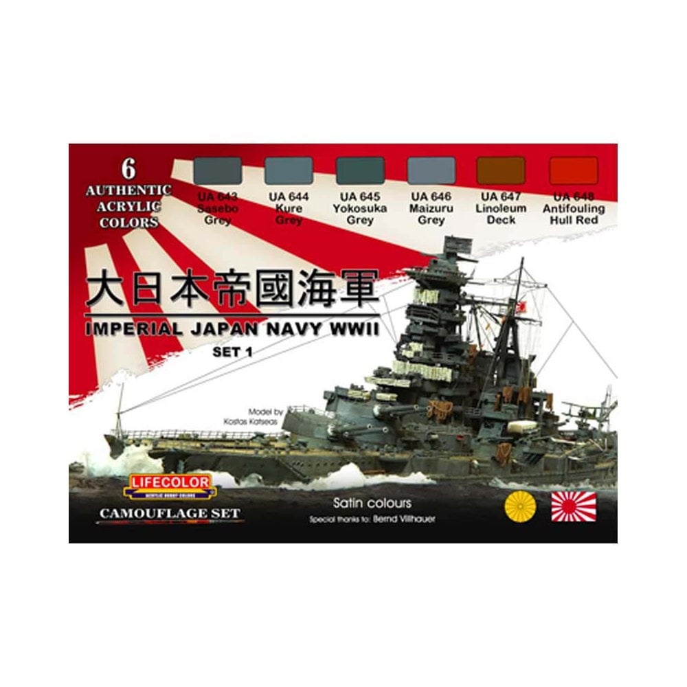 LifeColor’s CS-36 Imperial Japan Navy WWII Late War Set offers a finely tuned selection of six satin-finish acrylic paints tailored for modellers reproducing IJN warships from the later stages of World War II. Each tone reflects historic dockyard-specific hues used by the Imperial Japanese Navy for both superstructure and hulls.